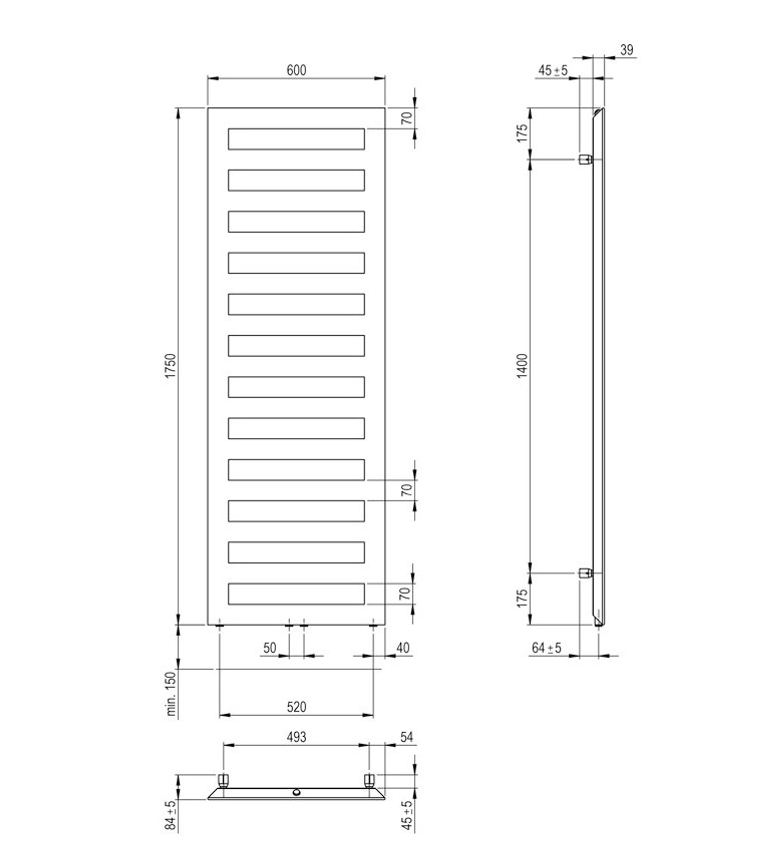 Zehnder Badheizkörper mit Mittelanschluß - RAL 9016 weiß - 1750x600mm - mit Befestigung